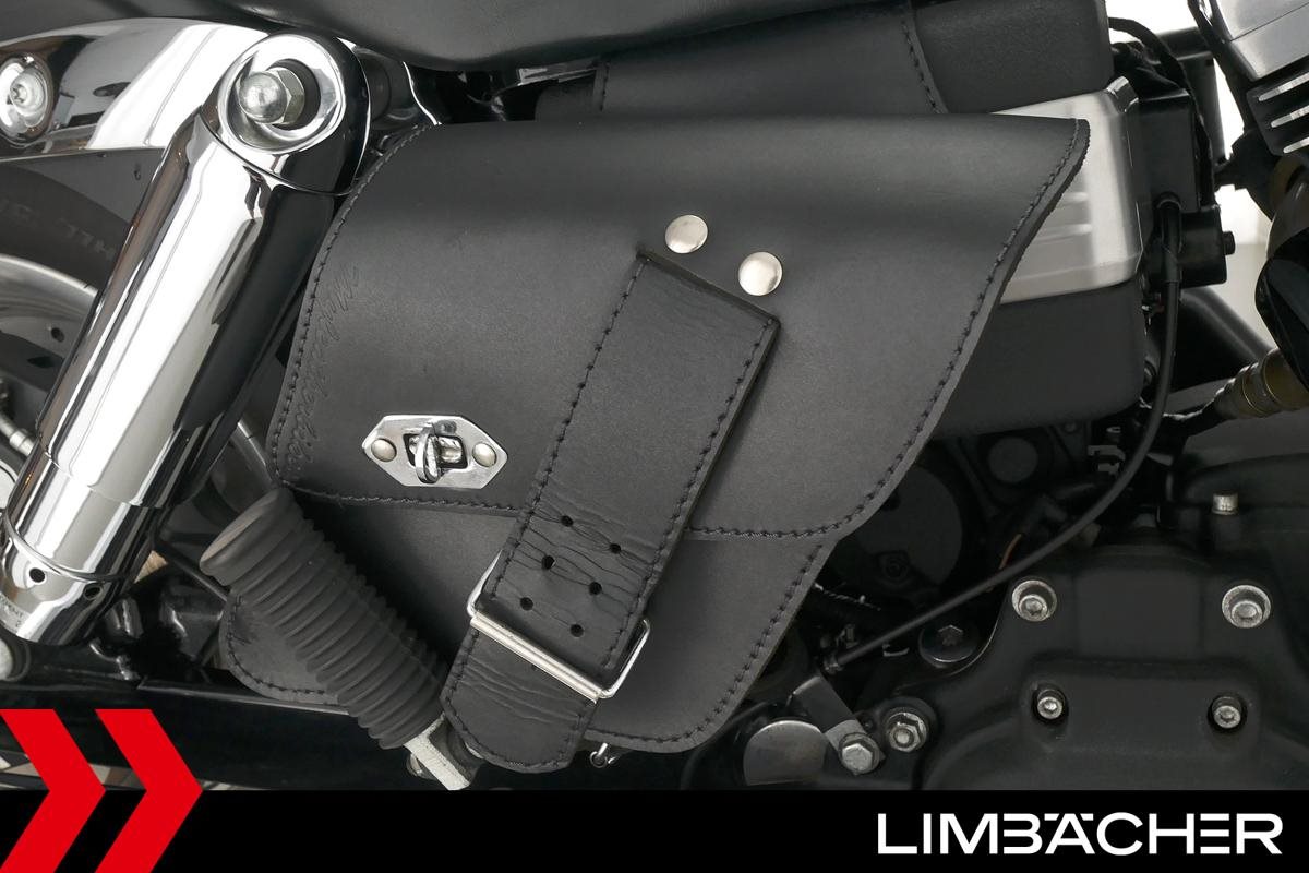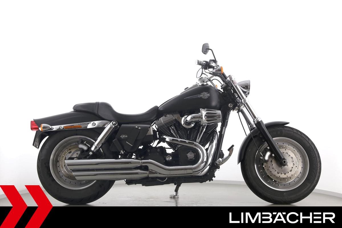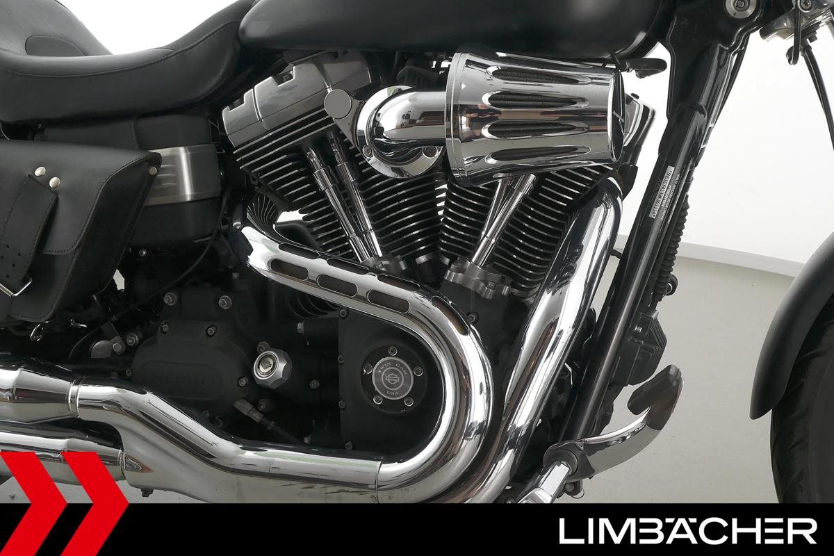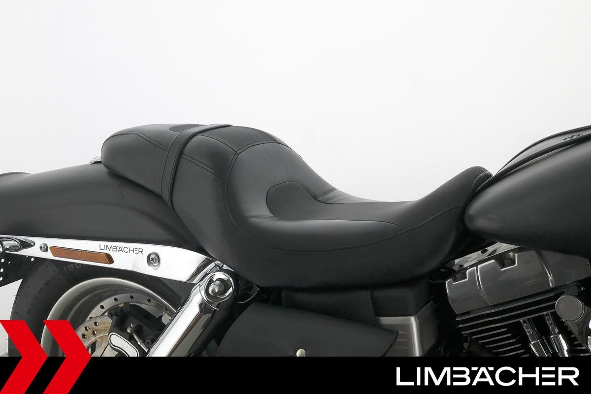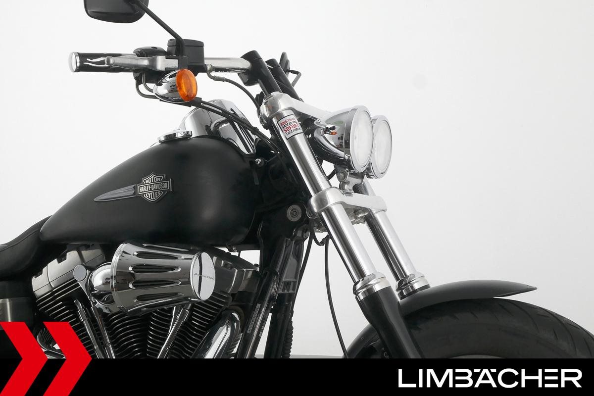 Eine Harley-Davidson Dyna Fat Bob FXDF in gepflegtem Zustand u.a. mit ScreaminEagle-Luftfiltergehäuse sowie Ledertasche am Rahmen.