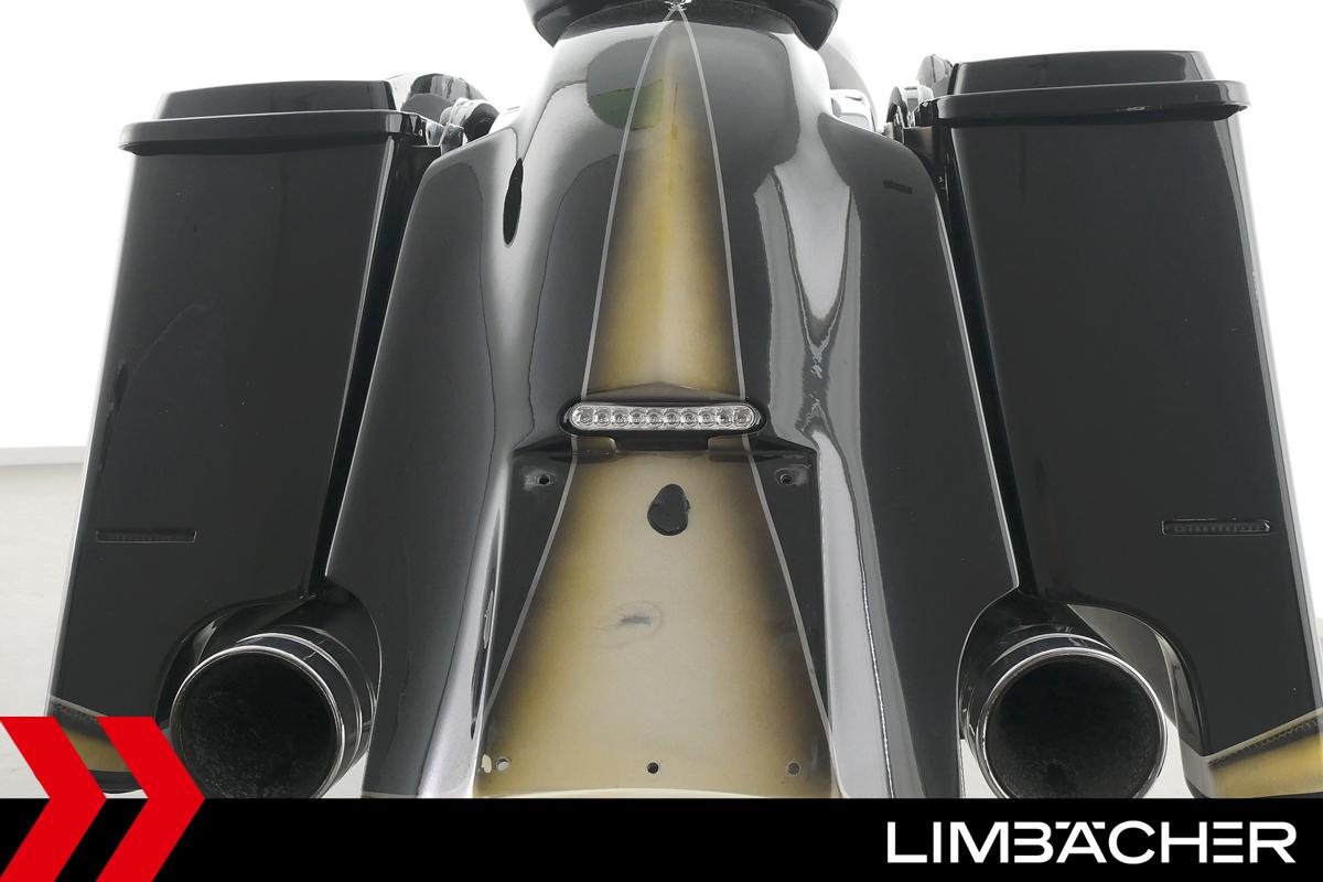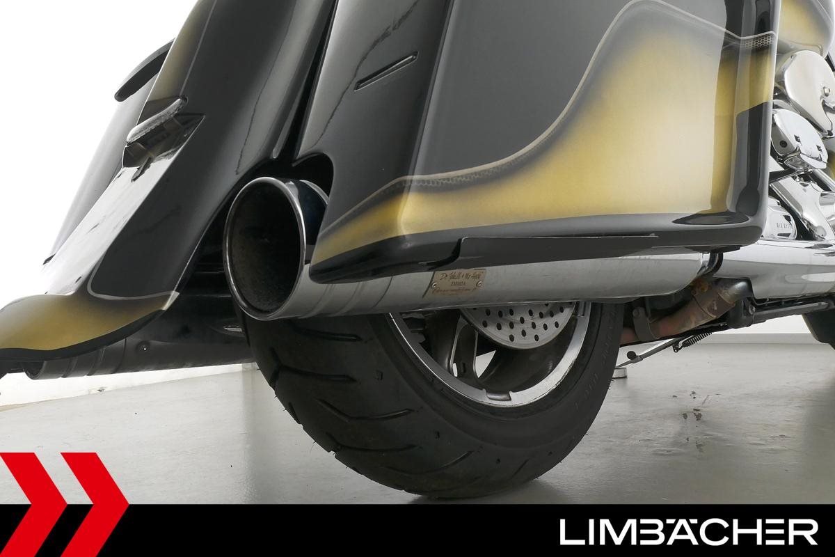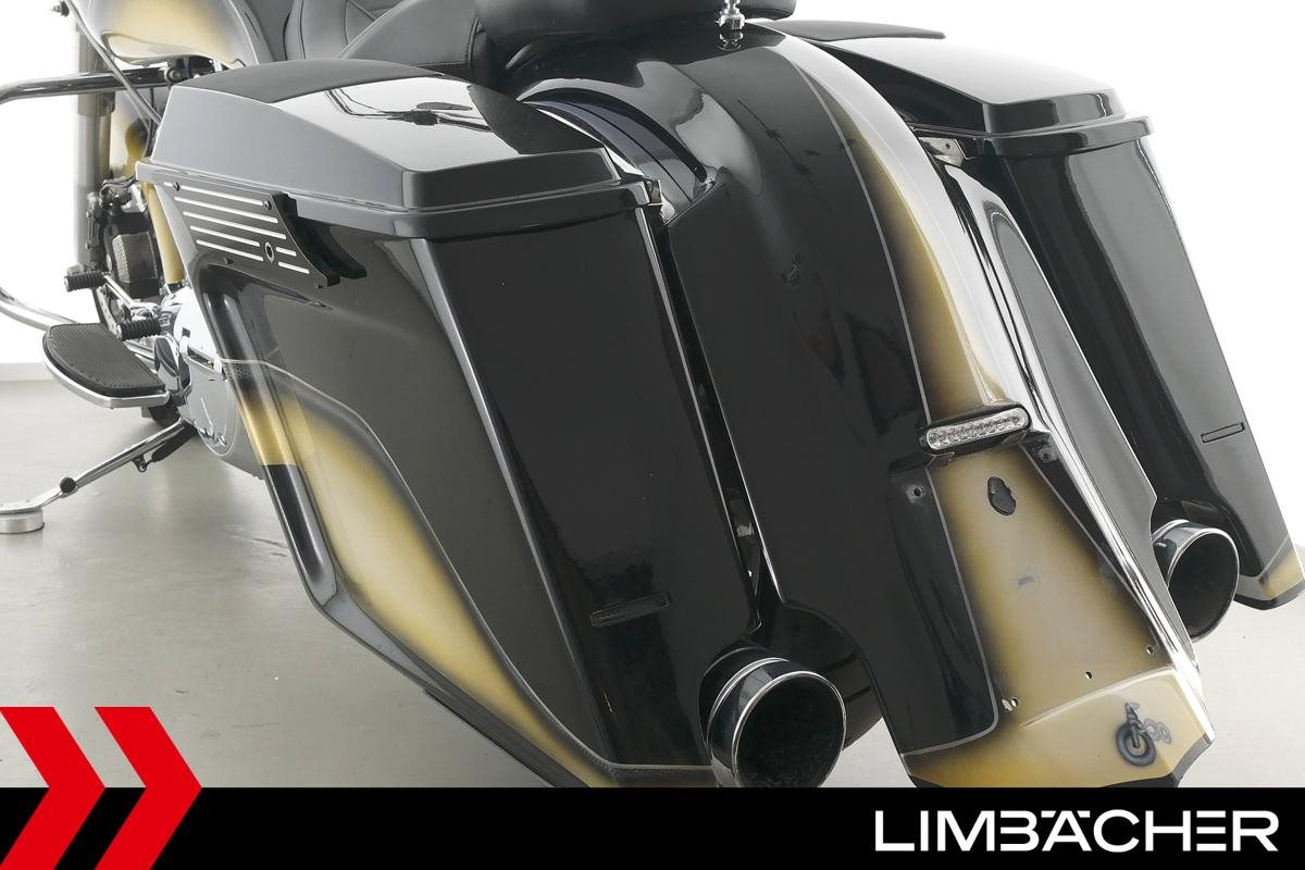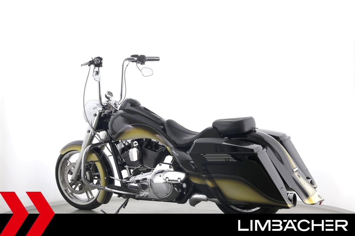 Eine scheckheftgepflegte Harley-Davidson Road King Classic FLHRC Chicano in sehr gepflegtem Zustand u.a. mit Jekill&Hyde-Klappenauspuff sowie Öhlins-Federbeinen.