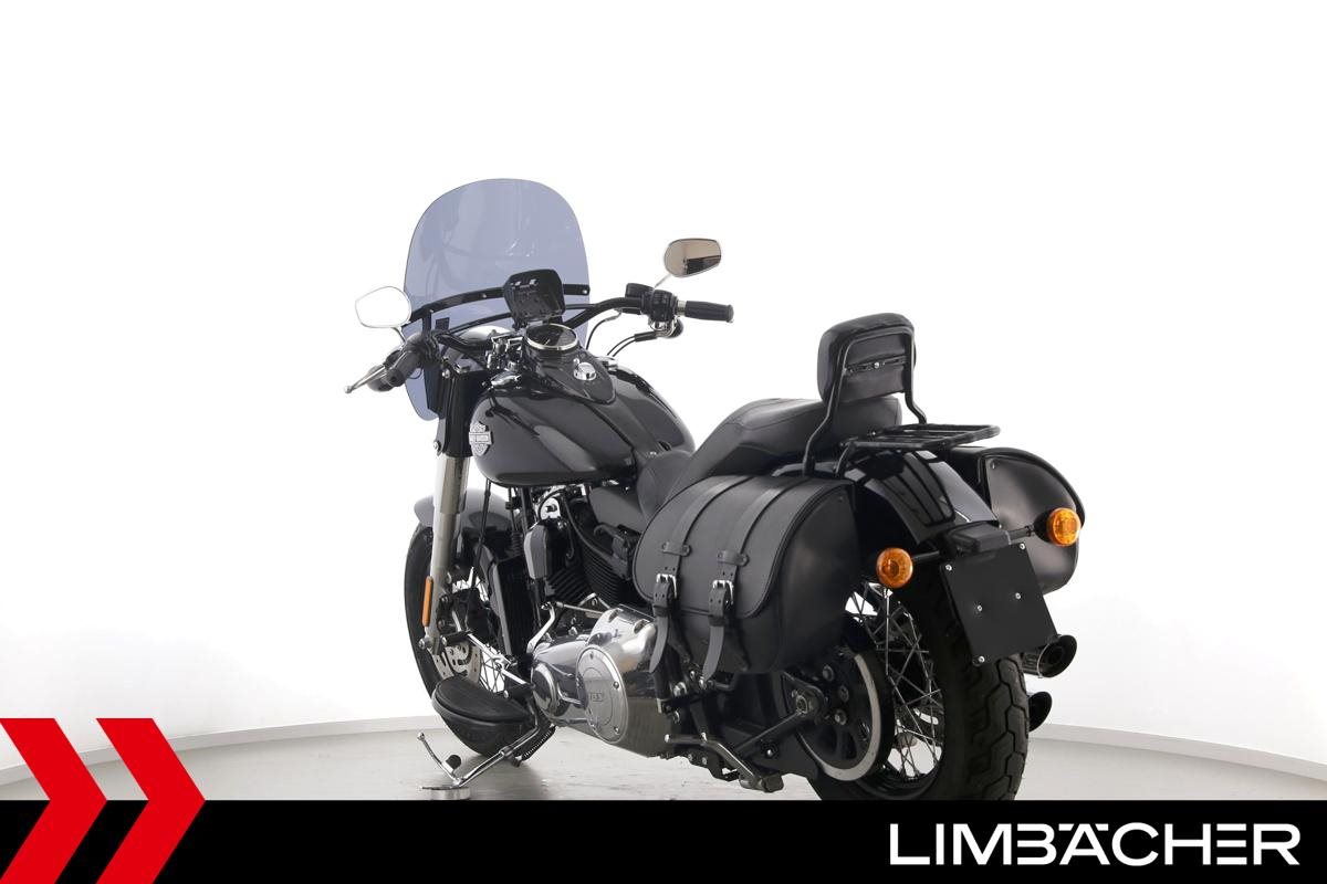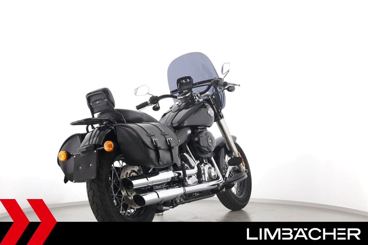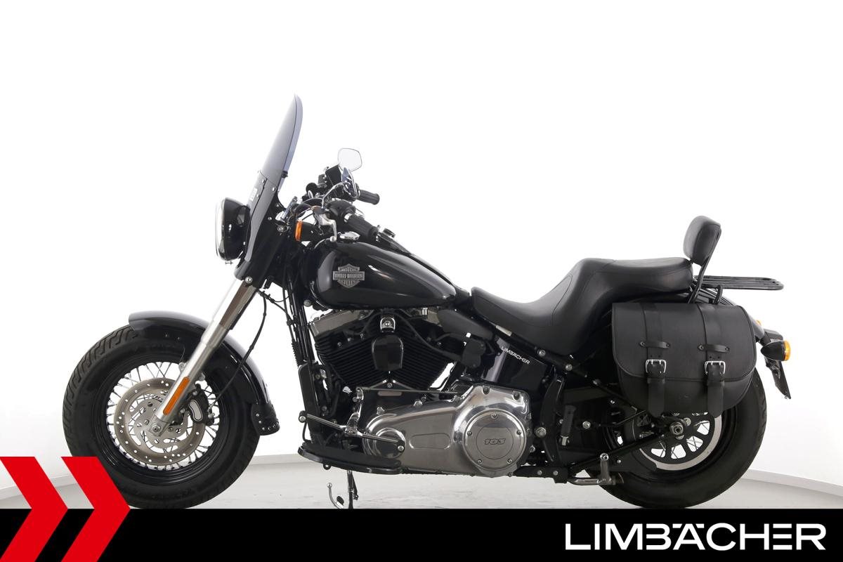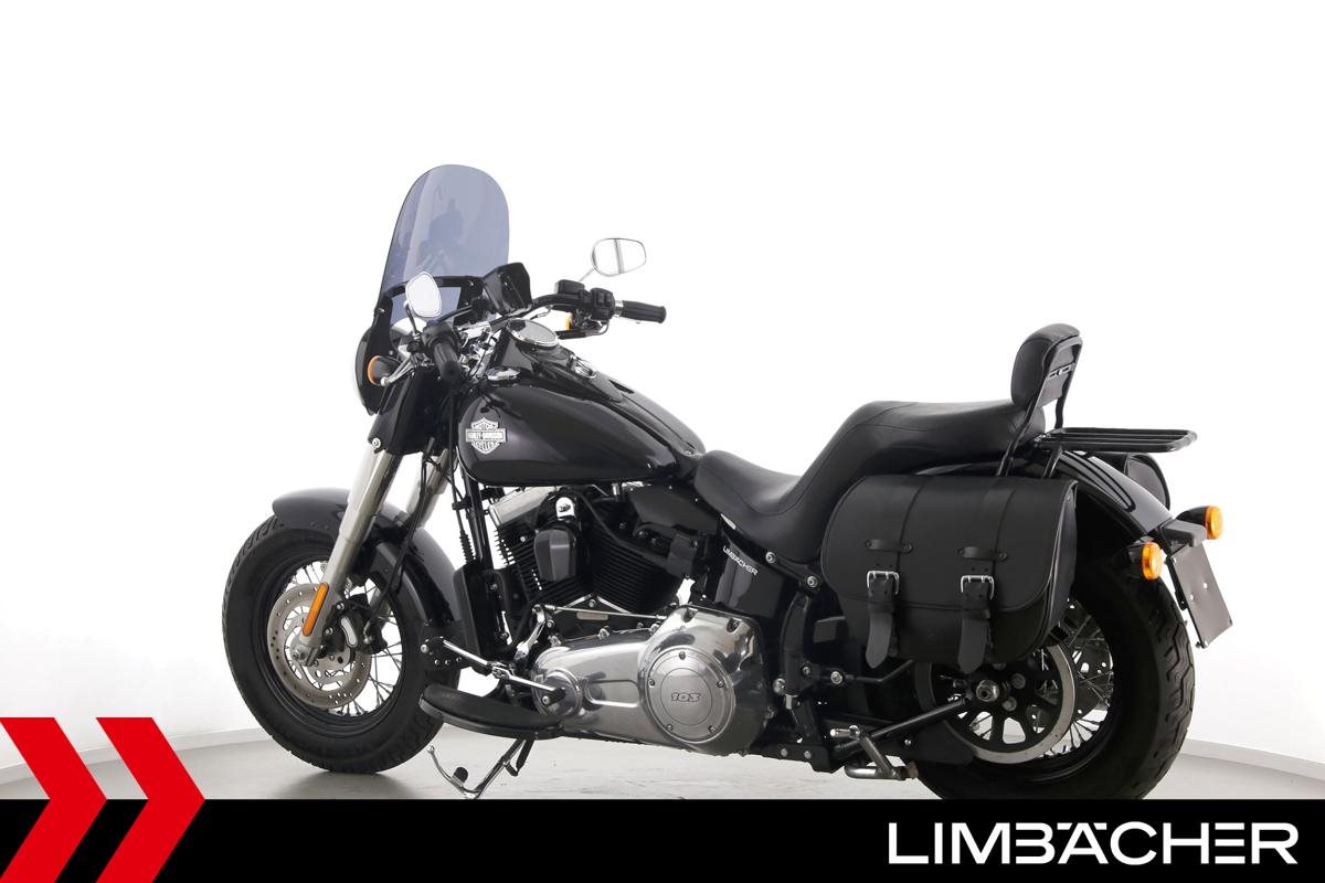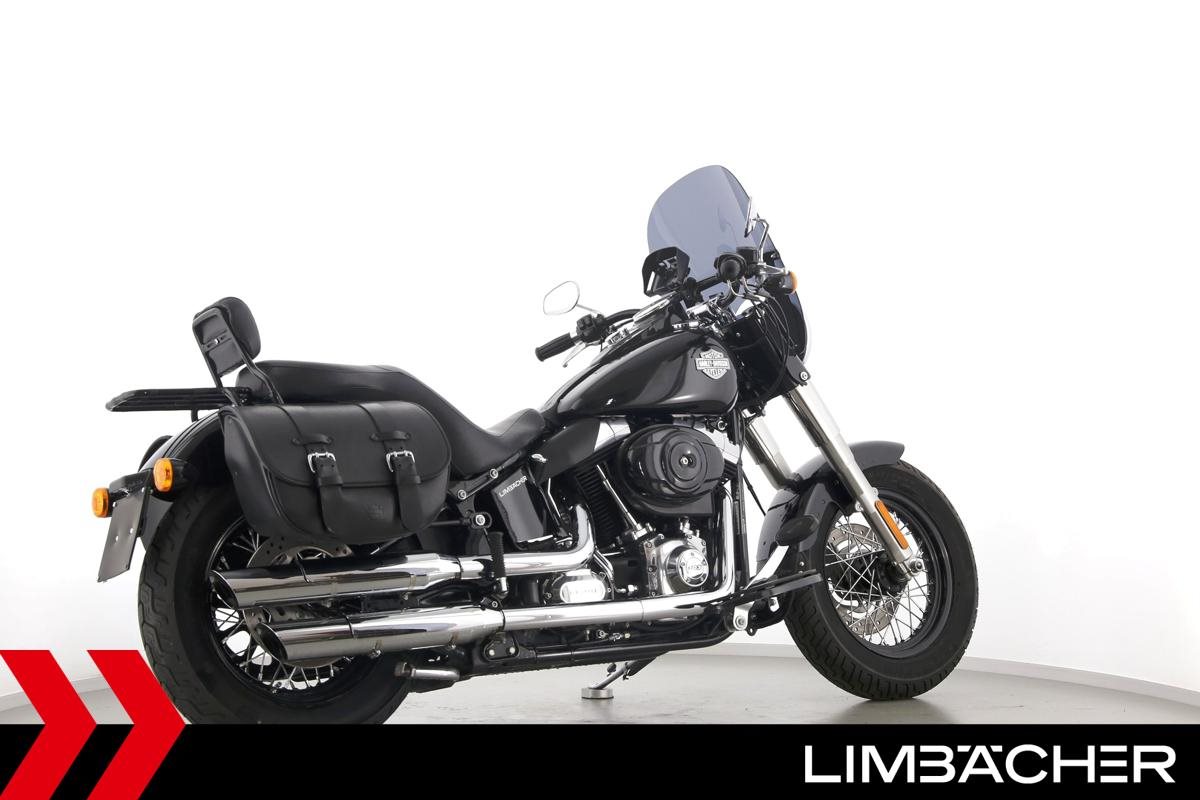 Eine scheckheftgepflegte Harley-Davidson Softail Slim FLS 103 aus zweiter Hand in sehr gepflegtem Zustand u.a. mit HD-Lederkoffern und Touring-Scheibe.