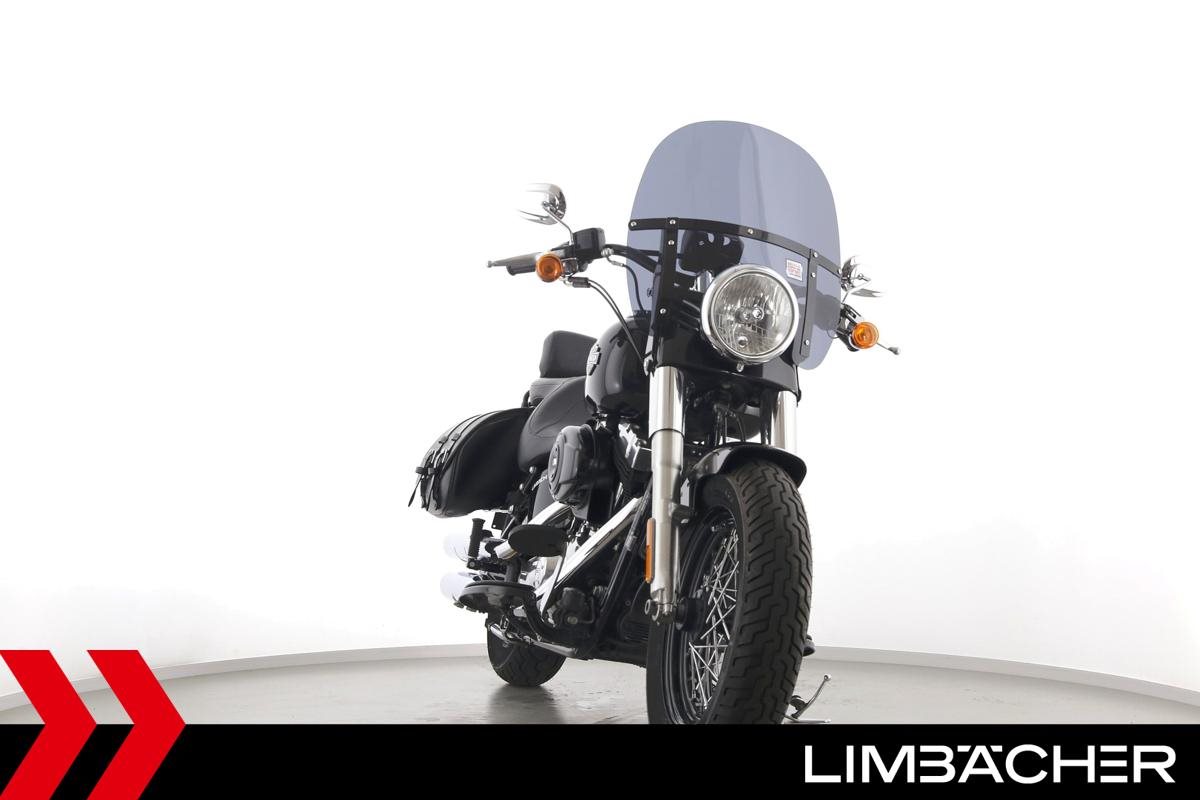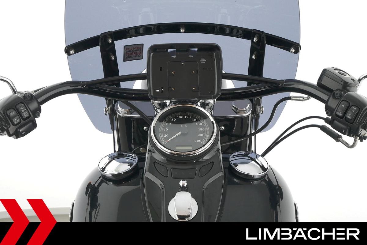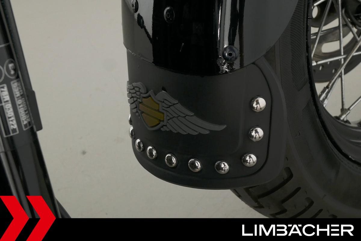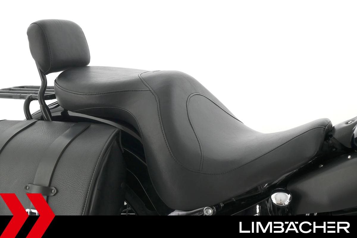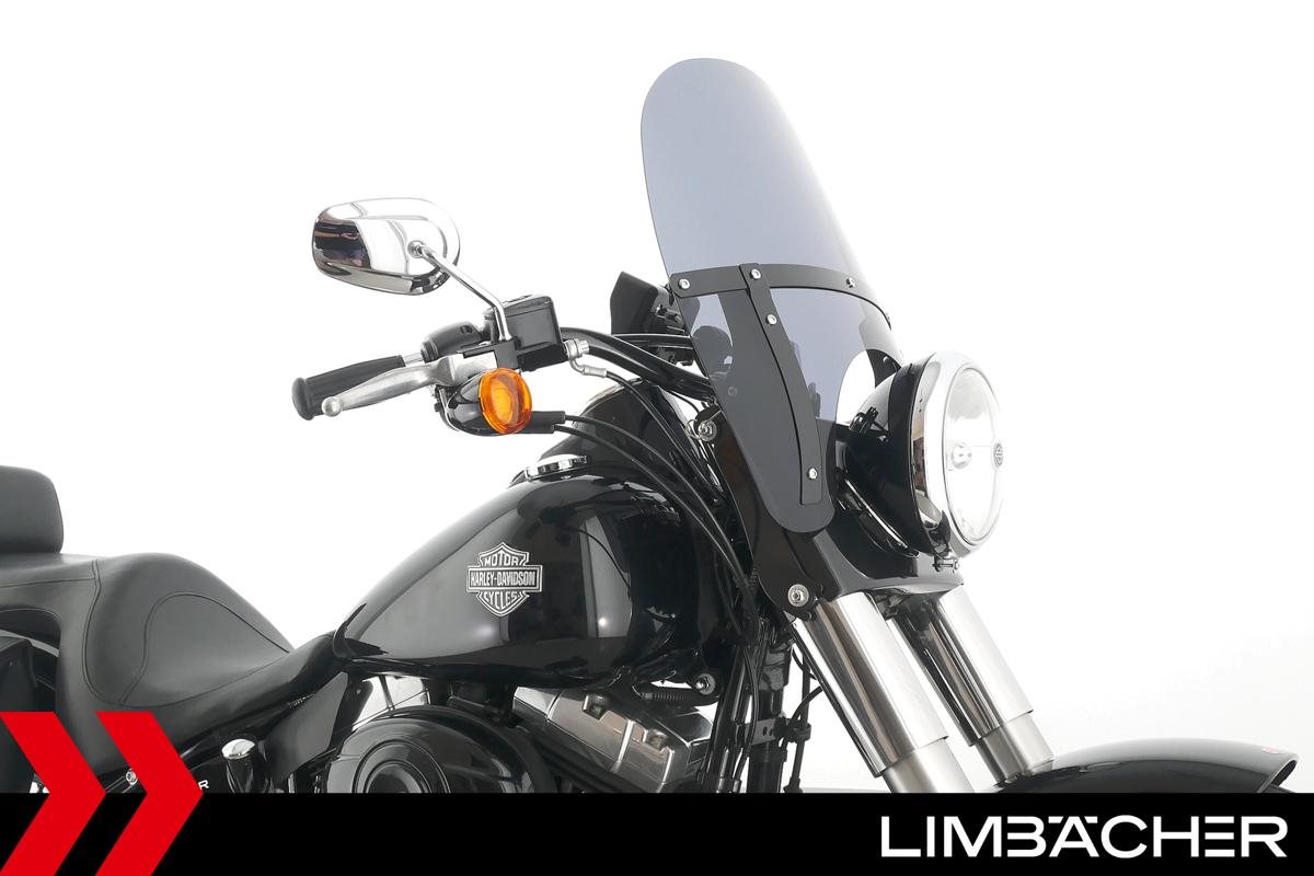 Eine scheckheftgepflegte Harley-Davidson Softail Slim FLS 103 aus zweiter Hand in sehr gepflegtem Zustand u.a. mit HD-Lederkoffern und Touring-Scheibe.