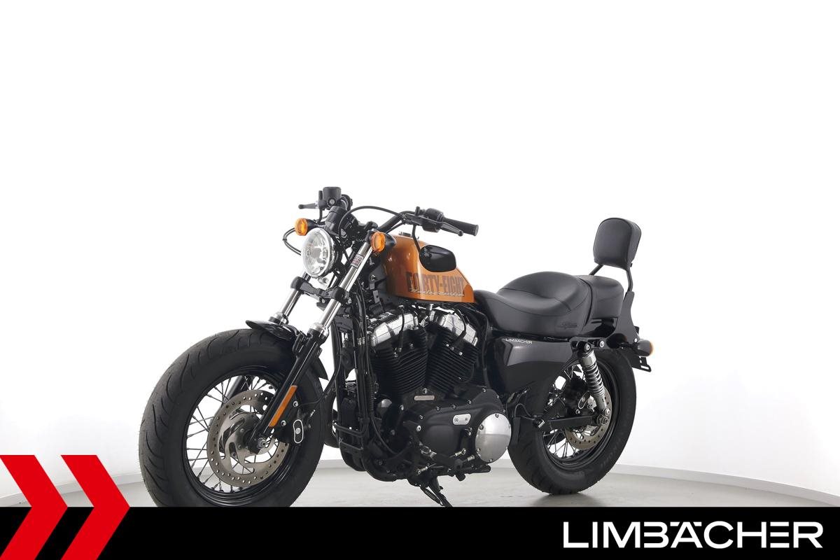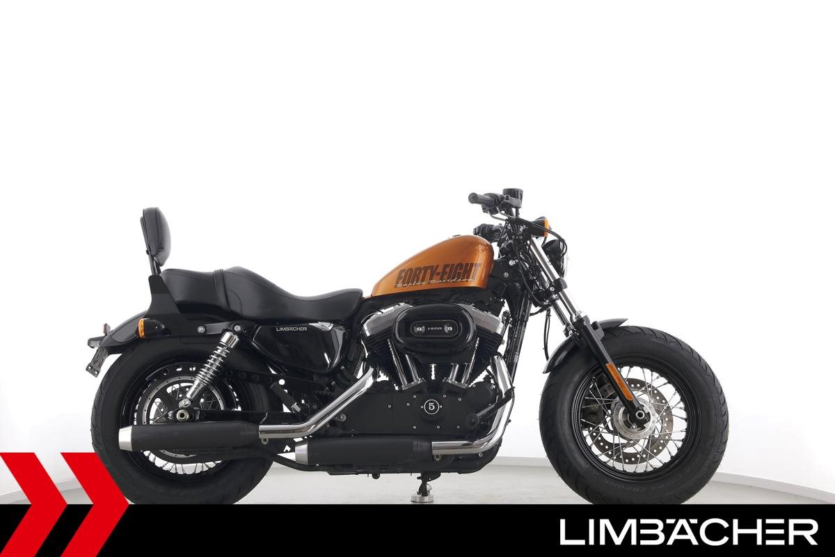 Eine Harley-Davidson Sportster XL 1200 X Forty Eight aus erster Hand in gepflegtem Zustand u.a. mit Miller-Endschalldämpfer und Komfort-Doppelsitzbank.