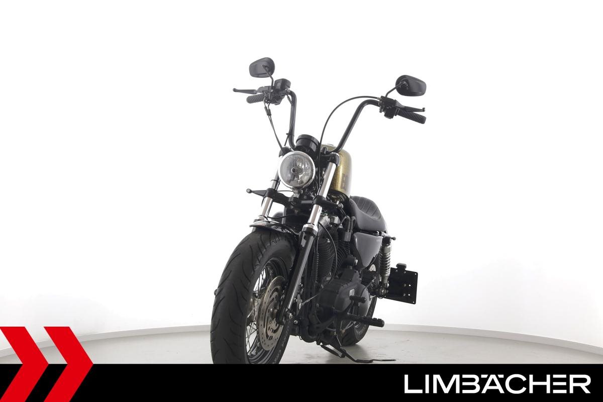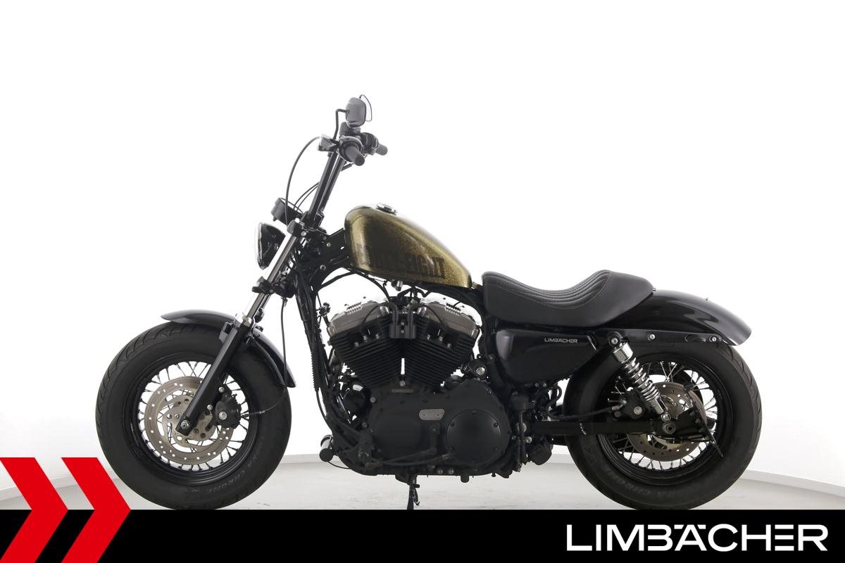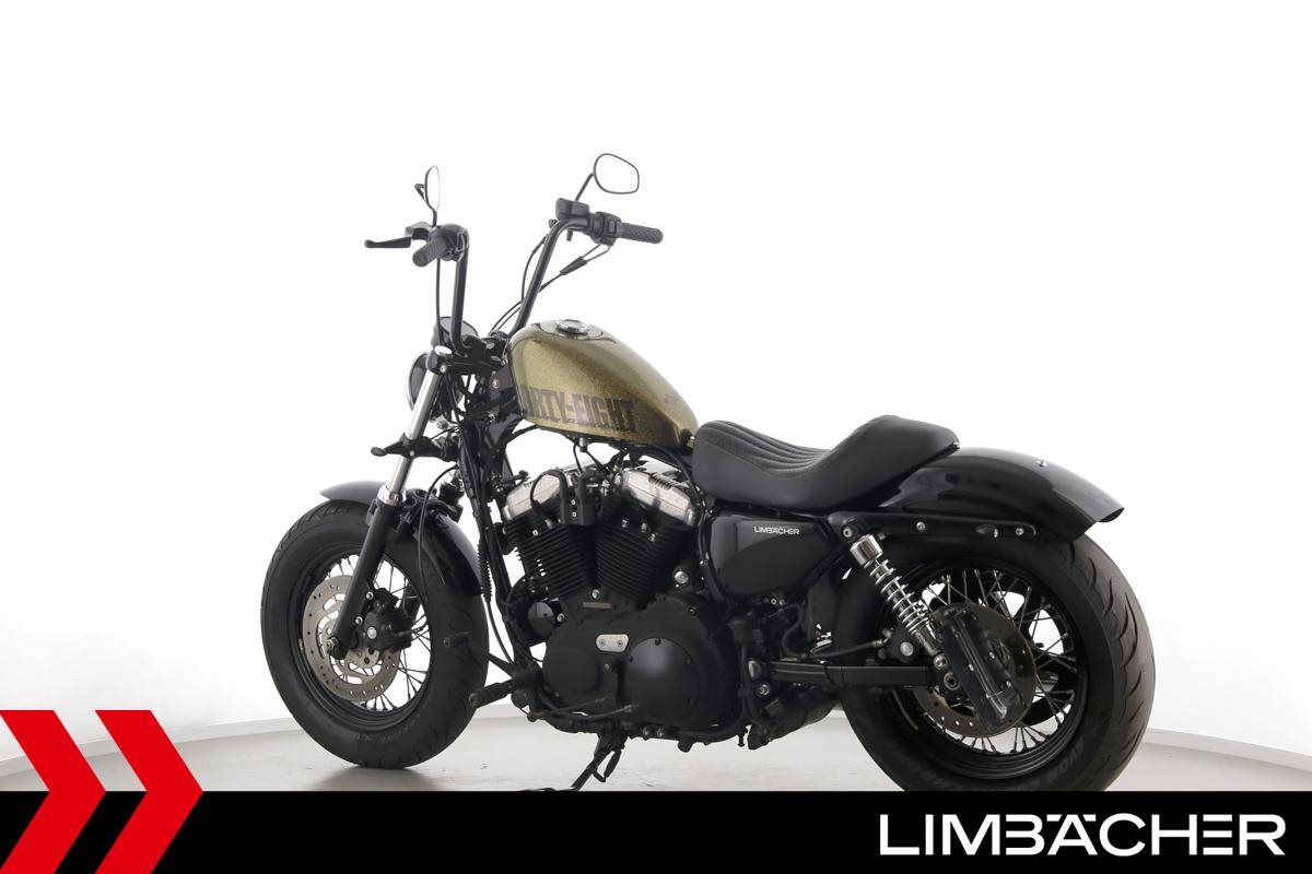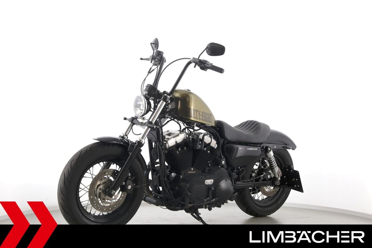 Eine Harley-Davidson Sportster XL 1200 X Forty Eight in gebrauchtem Zustand u.a. mit MJC-Endschalldämpfer sowie seitlichem Kennzeichenhalter.