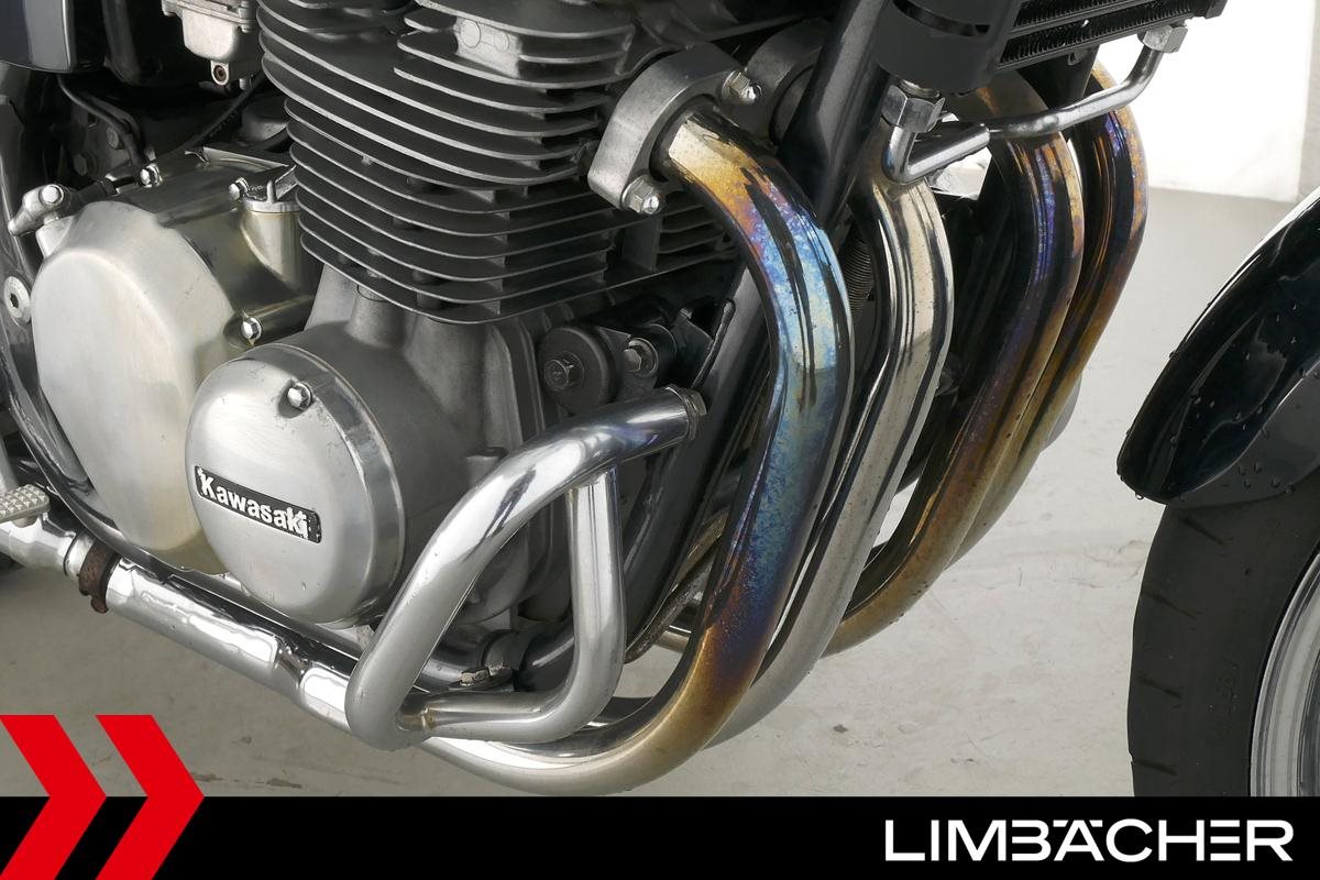 Eine Kawasaki ZR 750 C in gebrauchtem Zustand u.a. mit Speichenrädern und Sturzbügel.