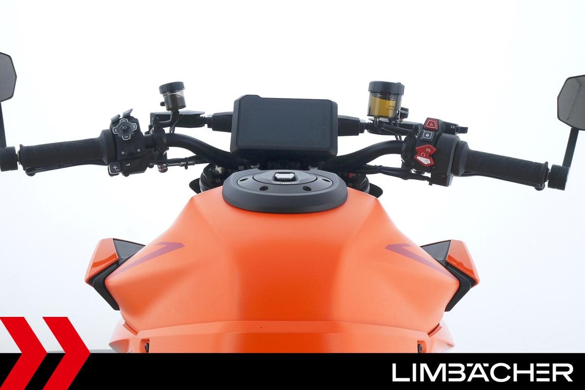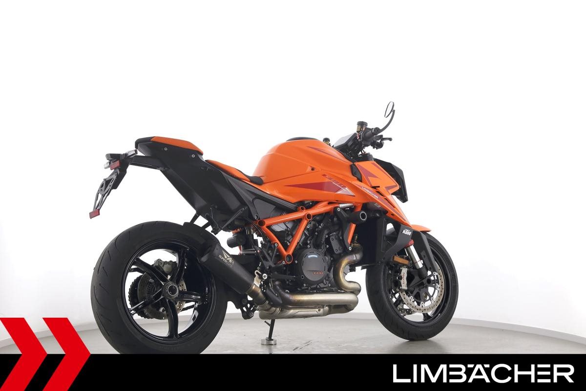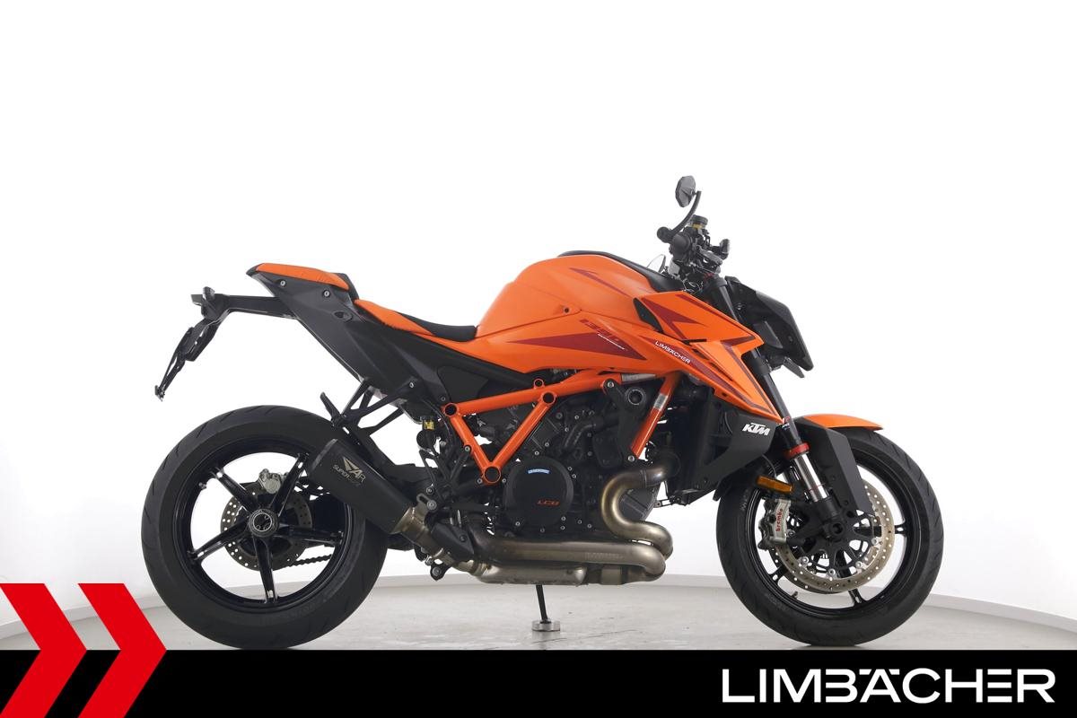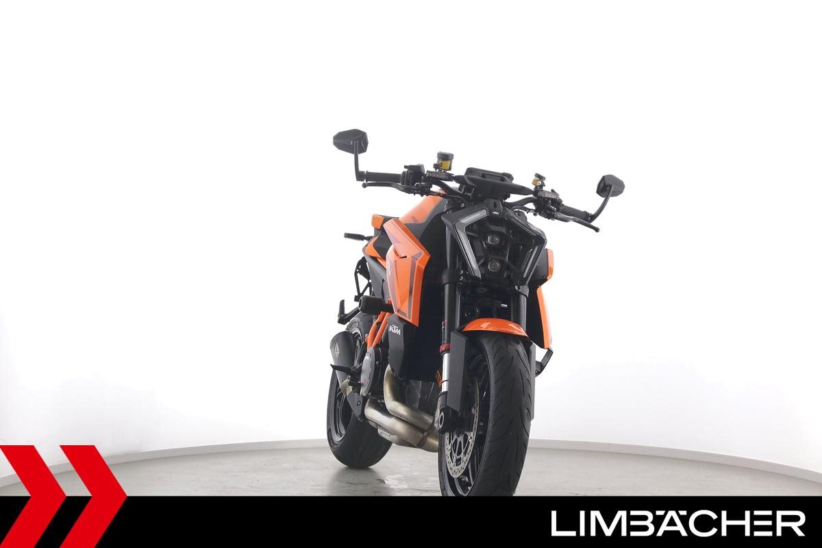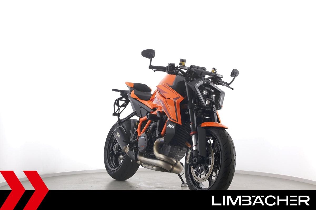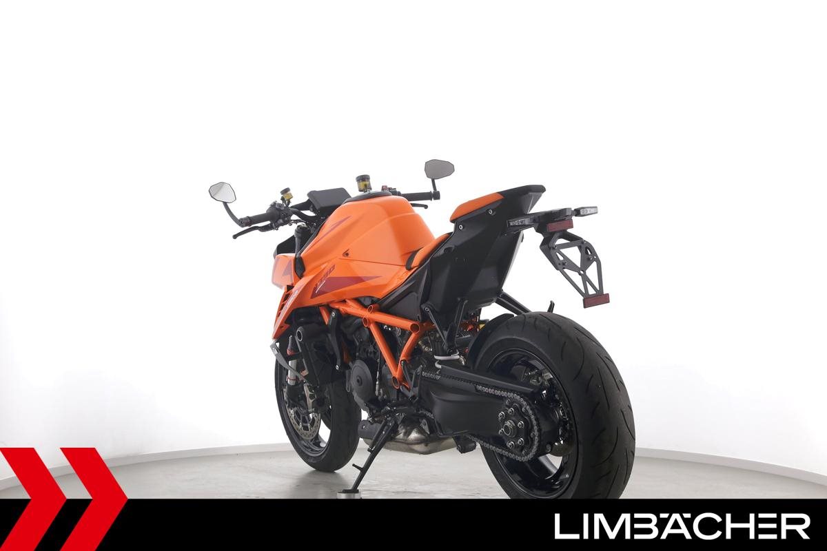 Eine KTM 1390 Super Duke R aus zweiter Hand in Topzustand u.a. mit Austin-Racing-Auspuff sowie Evotech-Performance-Sturzpads.