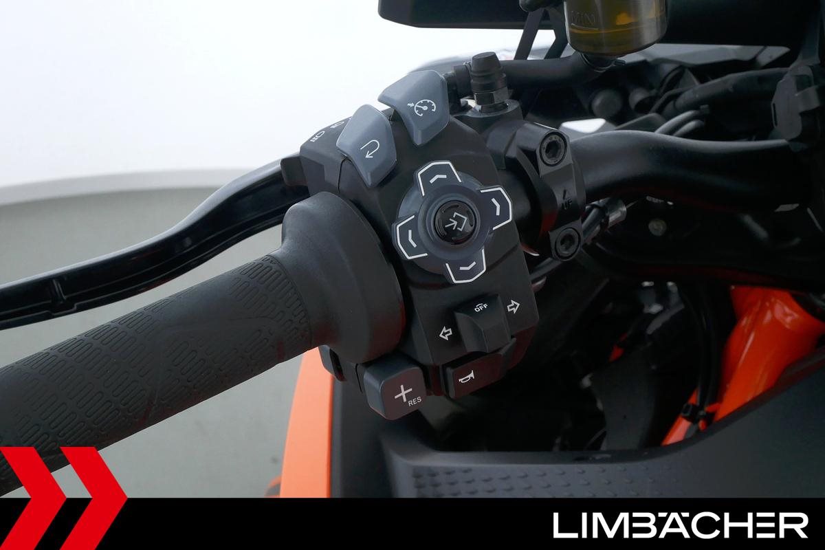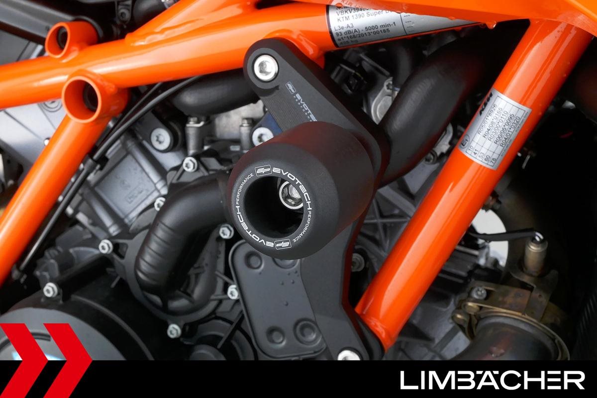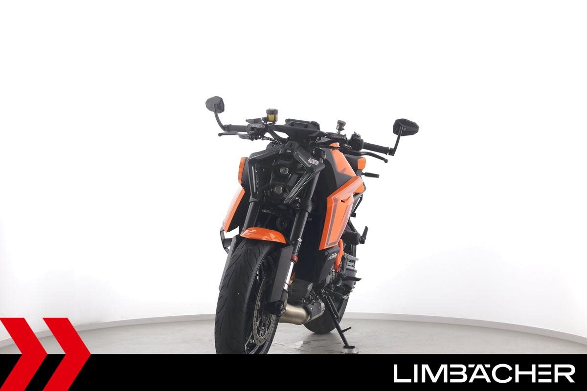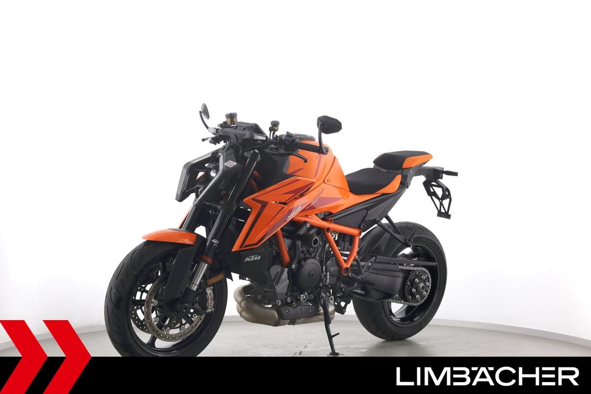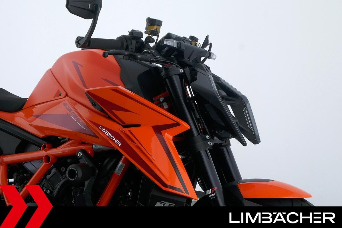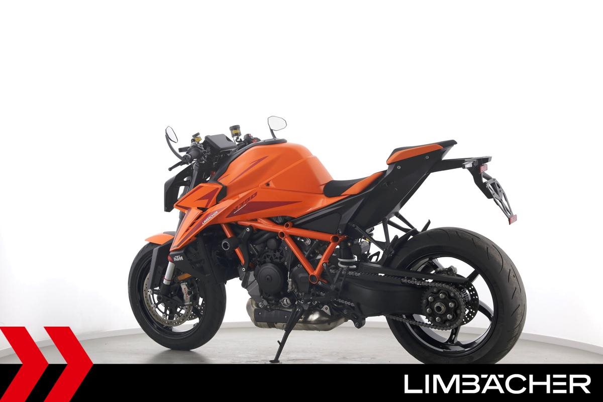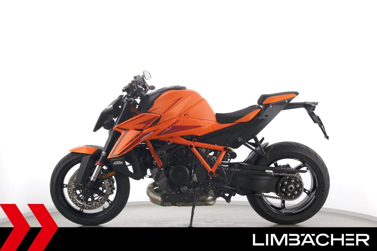 Eine KTM 1390 Super Duke R aus zweiter Hand in Topzustand u.a. mit Austin-Racing-Auspuff sowie Evotech-Performance-Sturzpads.