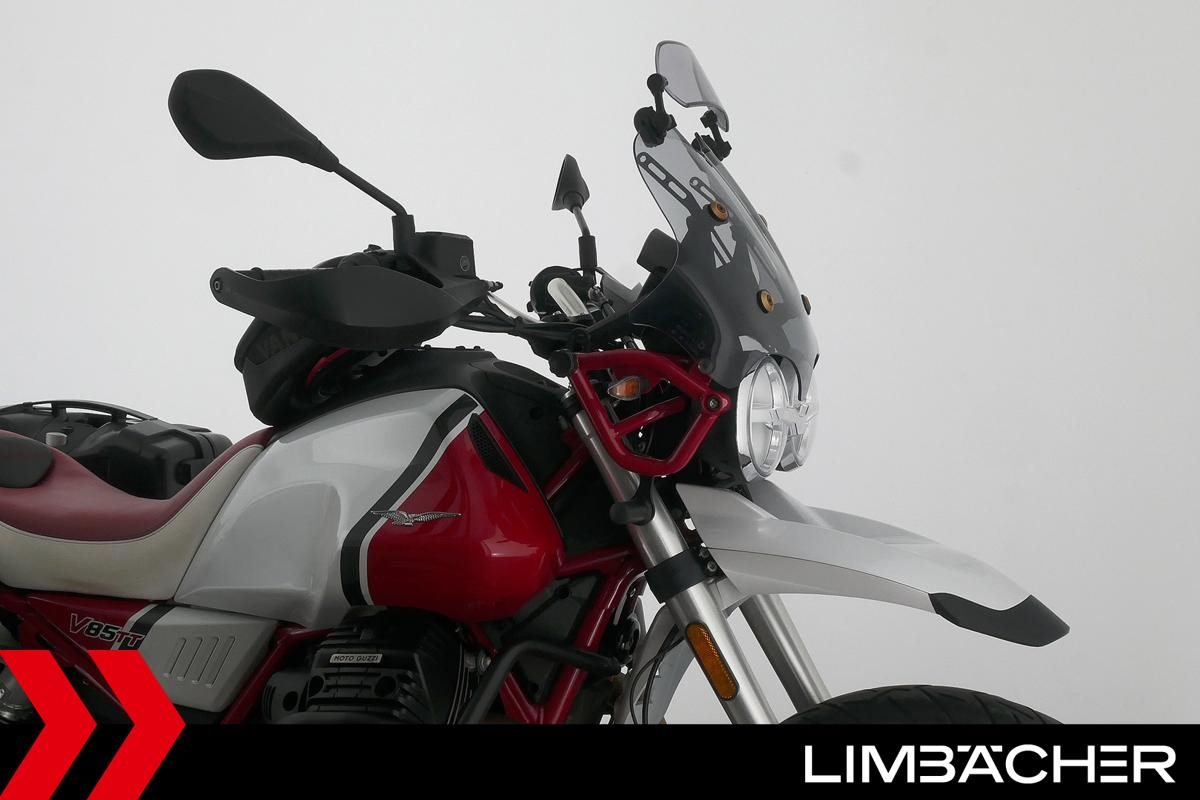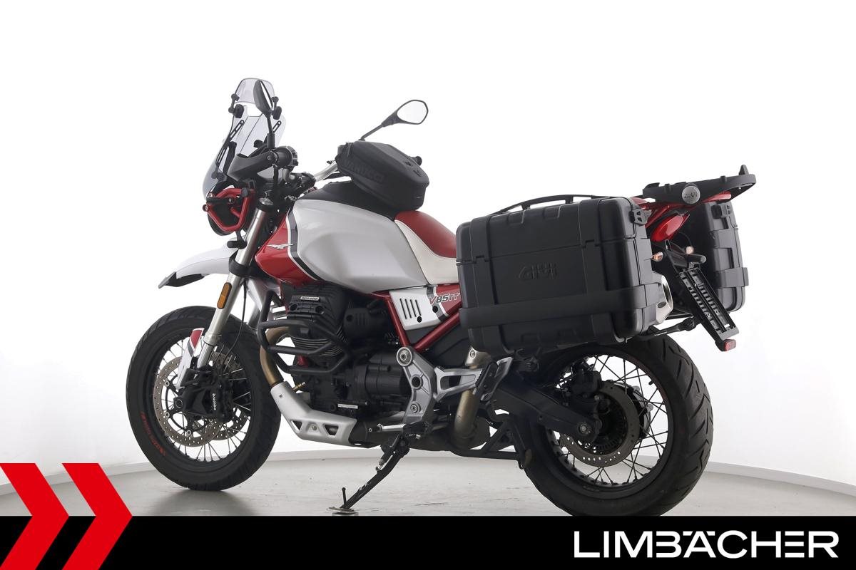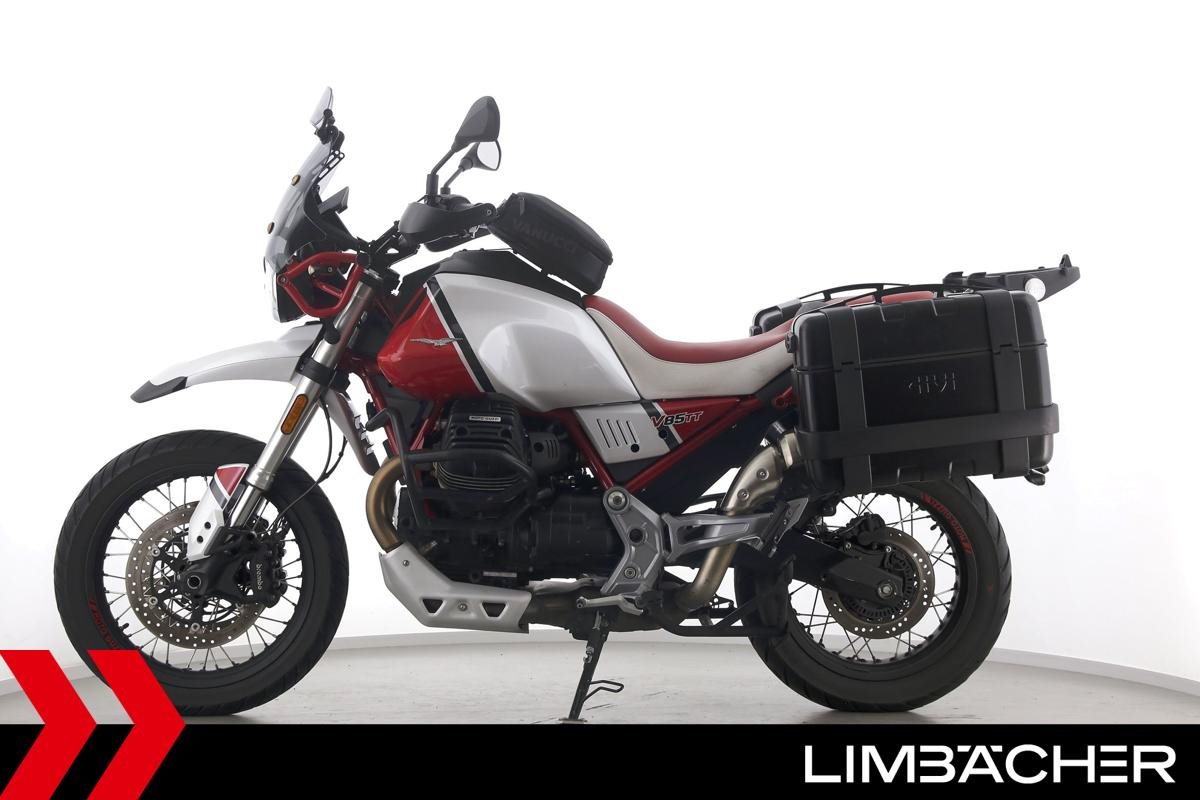 Eine Moto Guzzi V85 TT aus zweiter Hand in gepflegtem Zustand u.a. mit Givi-Koffersystem sowie Sturzbügeln in schwarz.