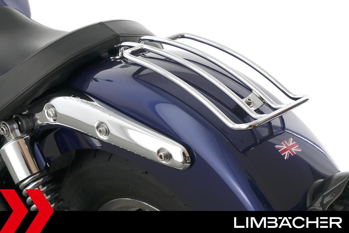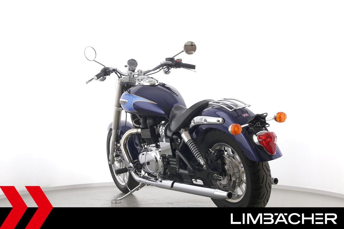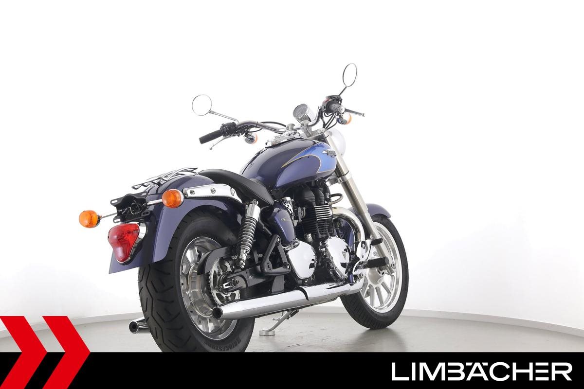 Eine Triumph America in gepflegtem Zustand mit Gepäckträger.