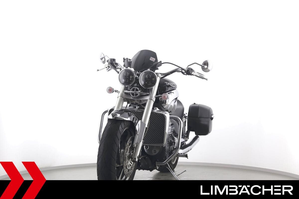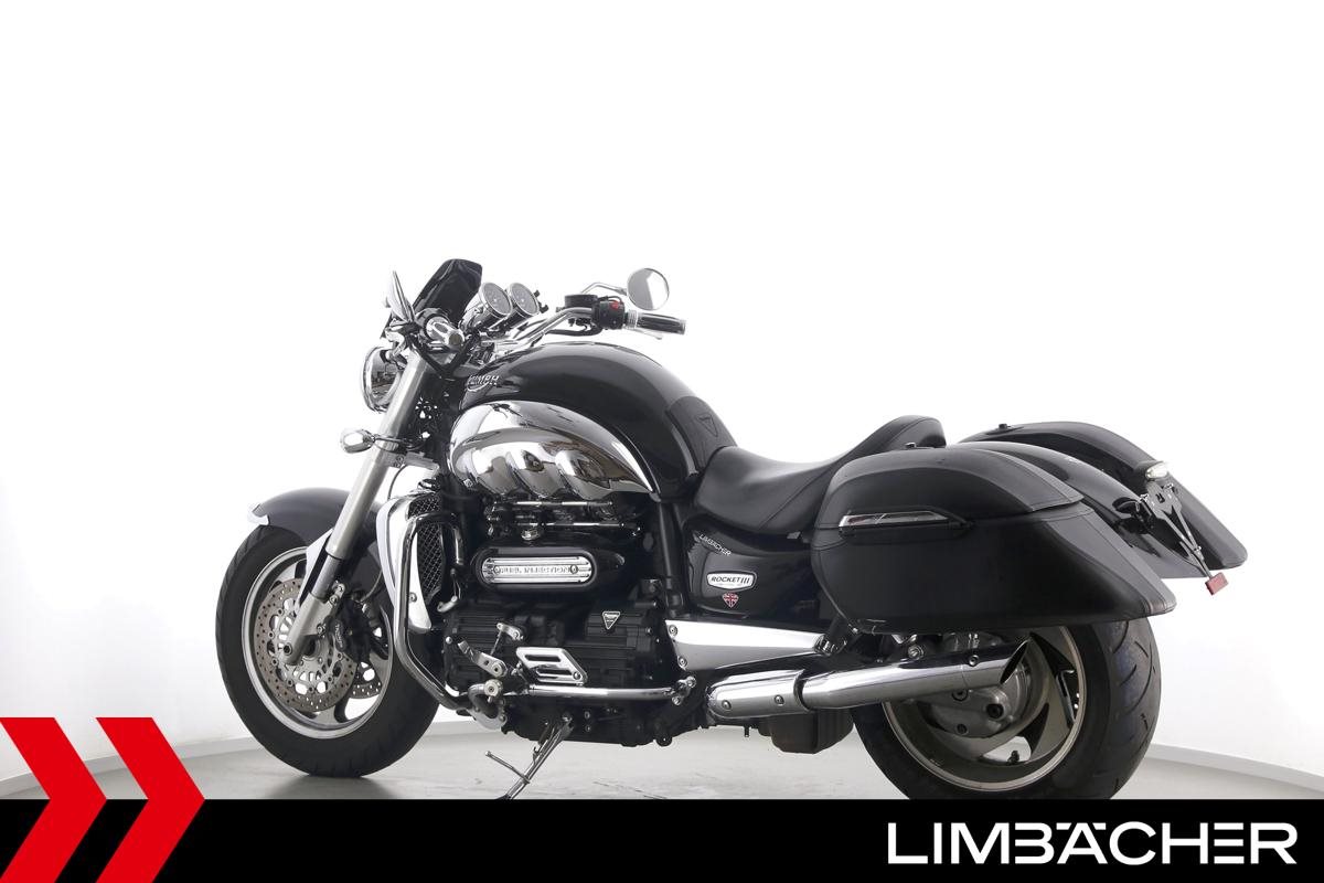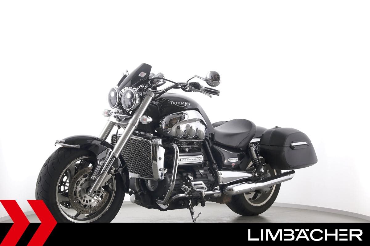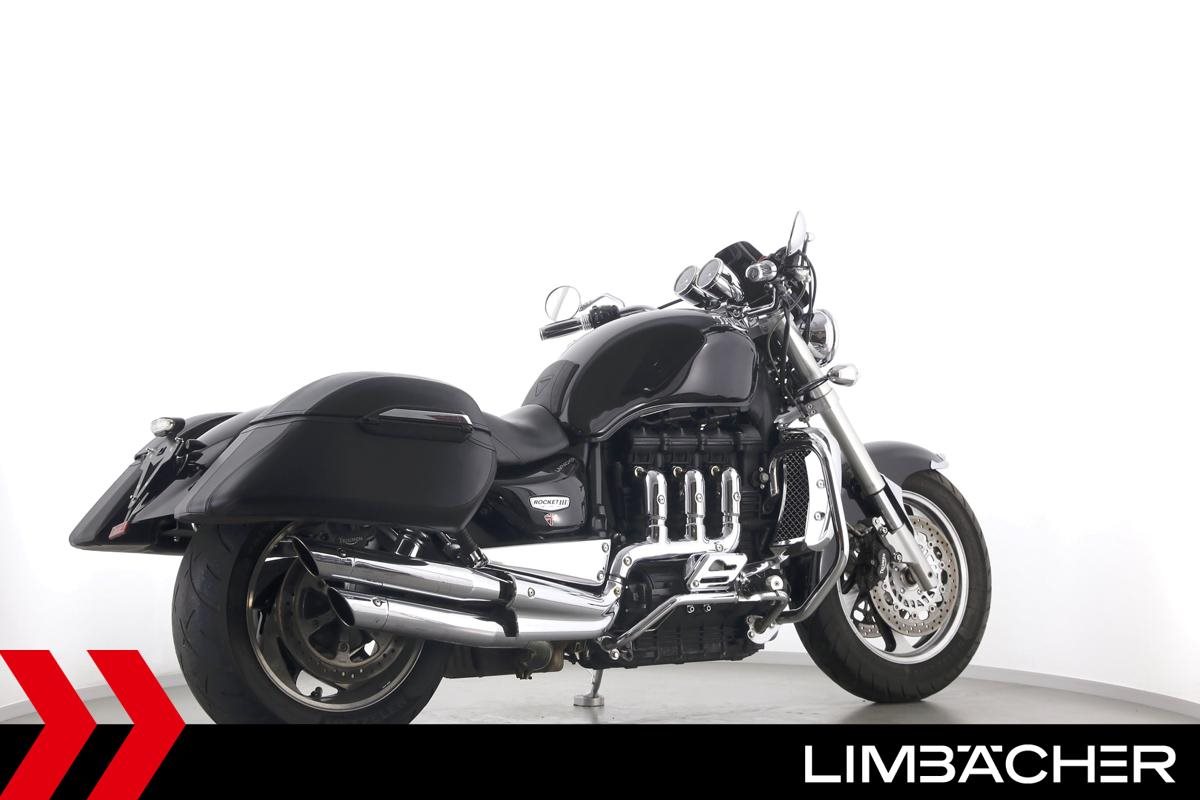 Eine Triumph Rocket III in gepflegtem Zustand u.a. mit Sport-Auspuff sowie Hepco & Becker-Lederkoffer.