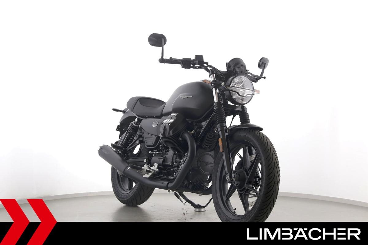 Eine Moto Guzzi V7 Stone als Neufahrzeug u.a. mit Mistral-Endschalldämpfer und Lenkerendenspiegeln.