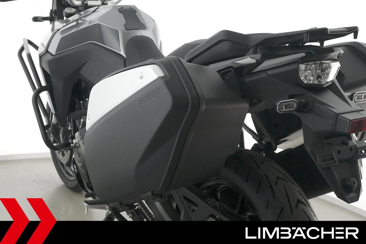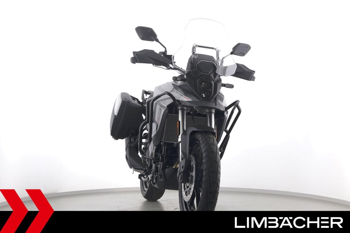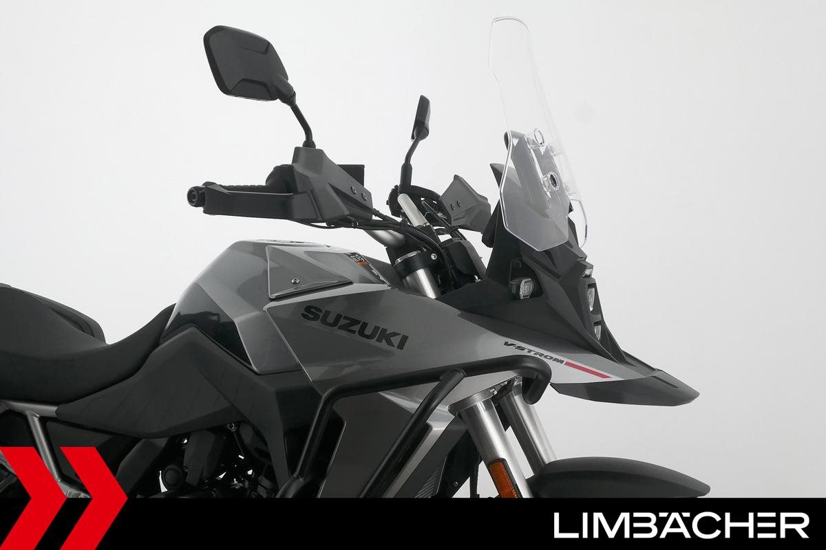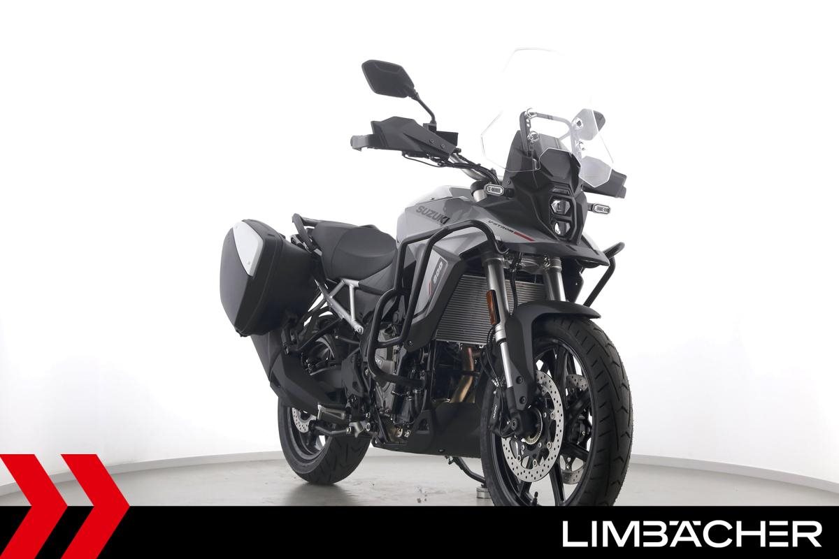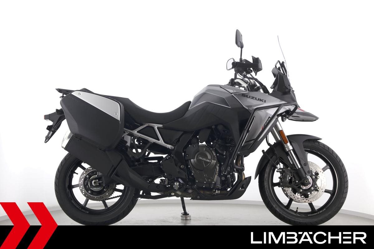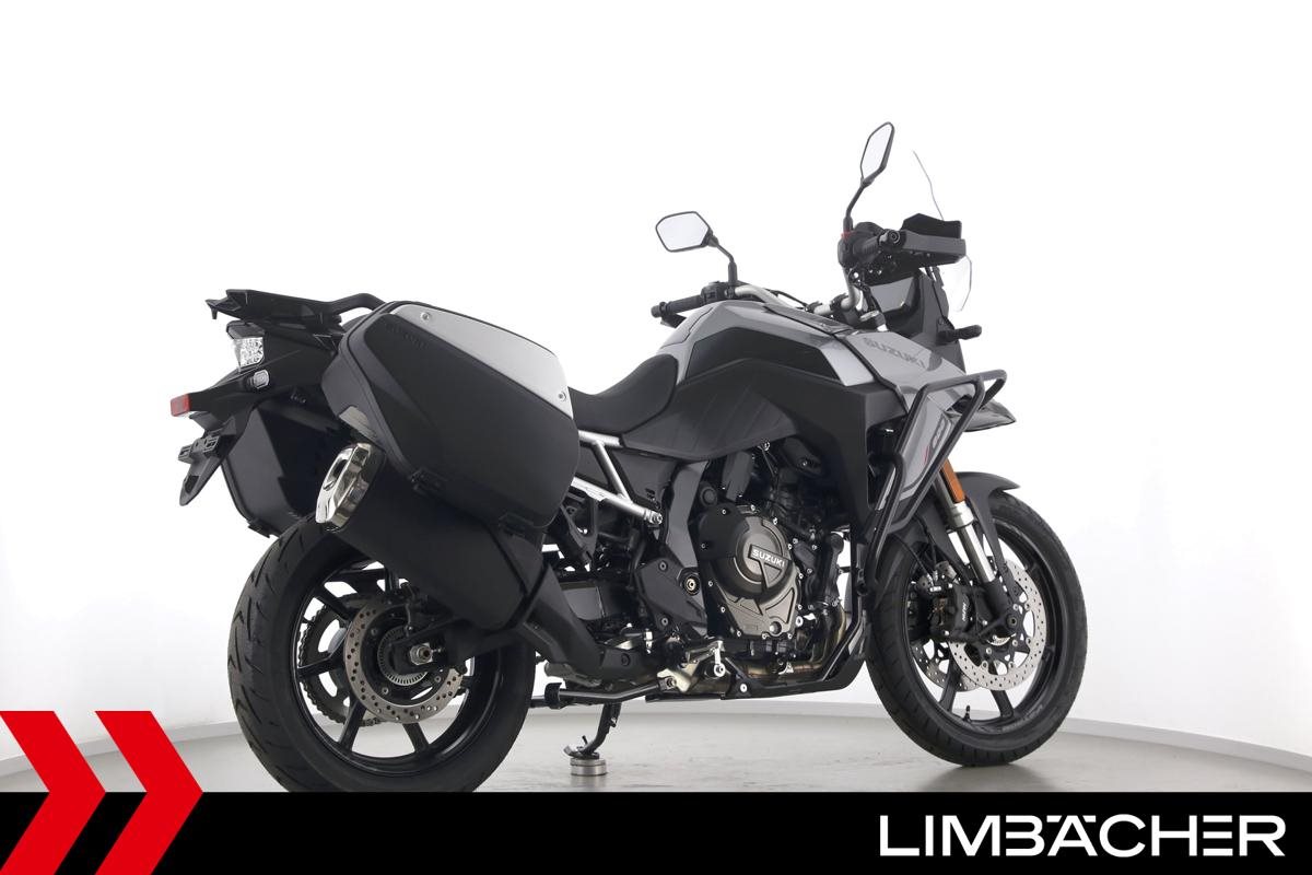 Eine Suzuki DL 800 V-Strom als Neufahrzeug u.a. mit Suzuki-Koffersystem gleichschließend sowie Sturzbügel in schwarz.