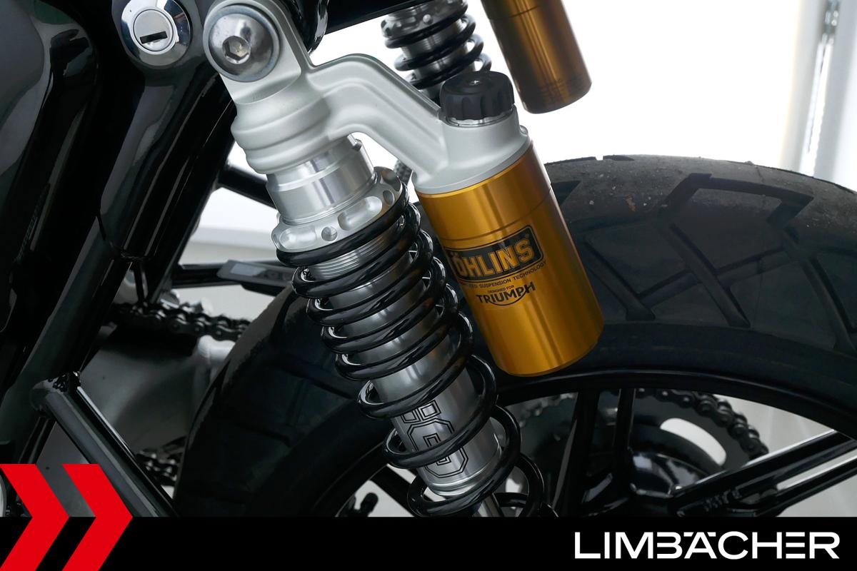 Eine neue Triumph Speed Twin 1200 u.a. mit kurzem Kennzeichenhalter sowie Öhlins-Stoßdämpfer hinten.
