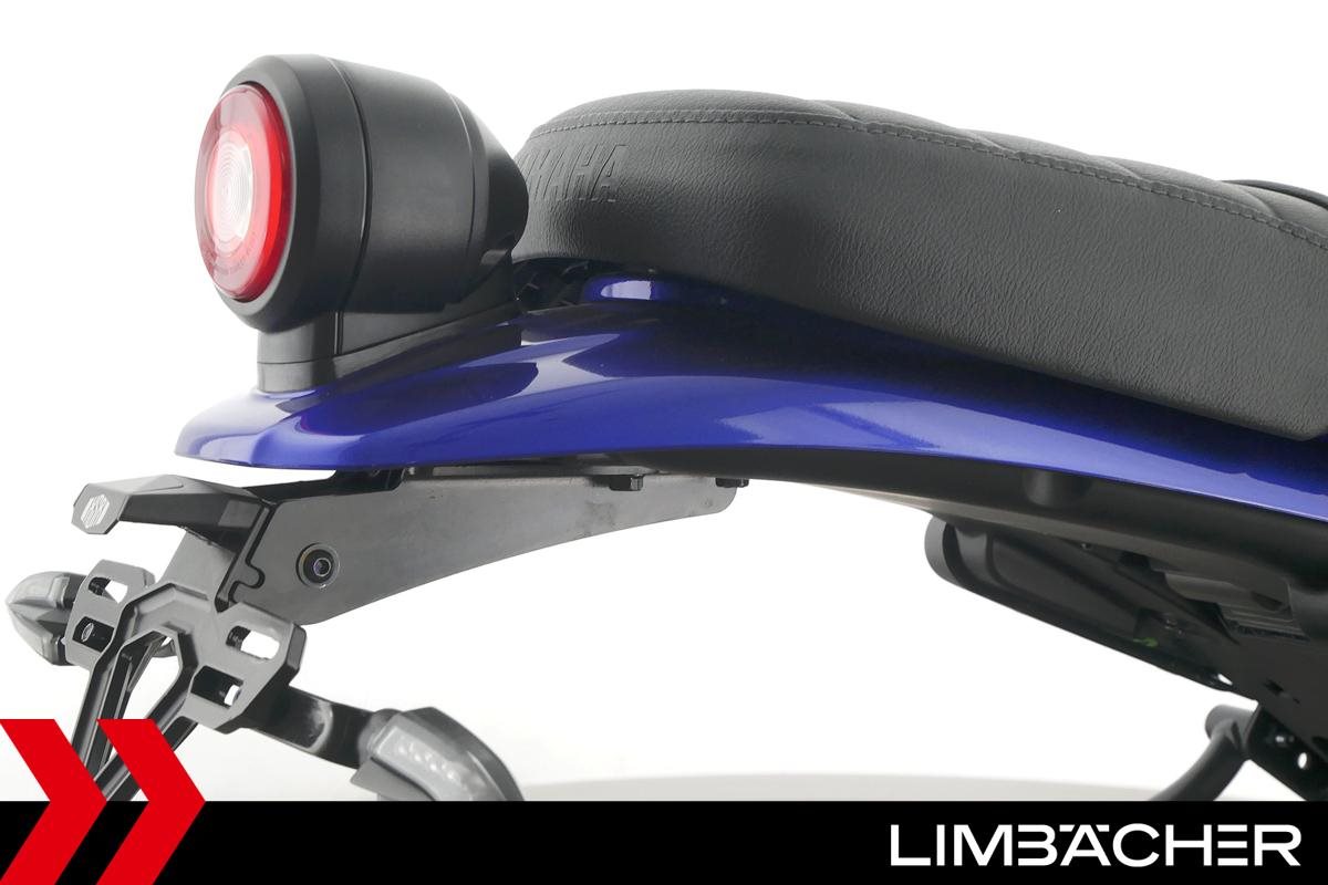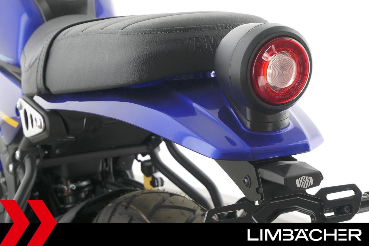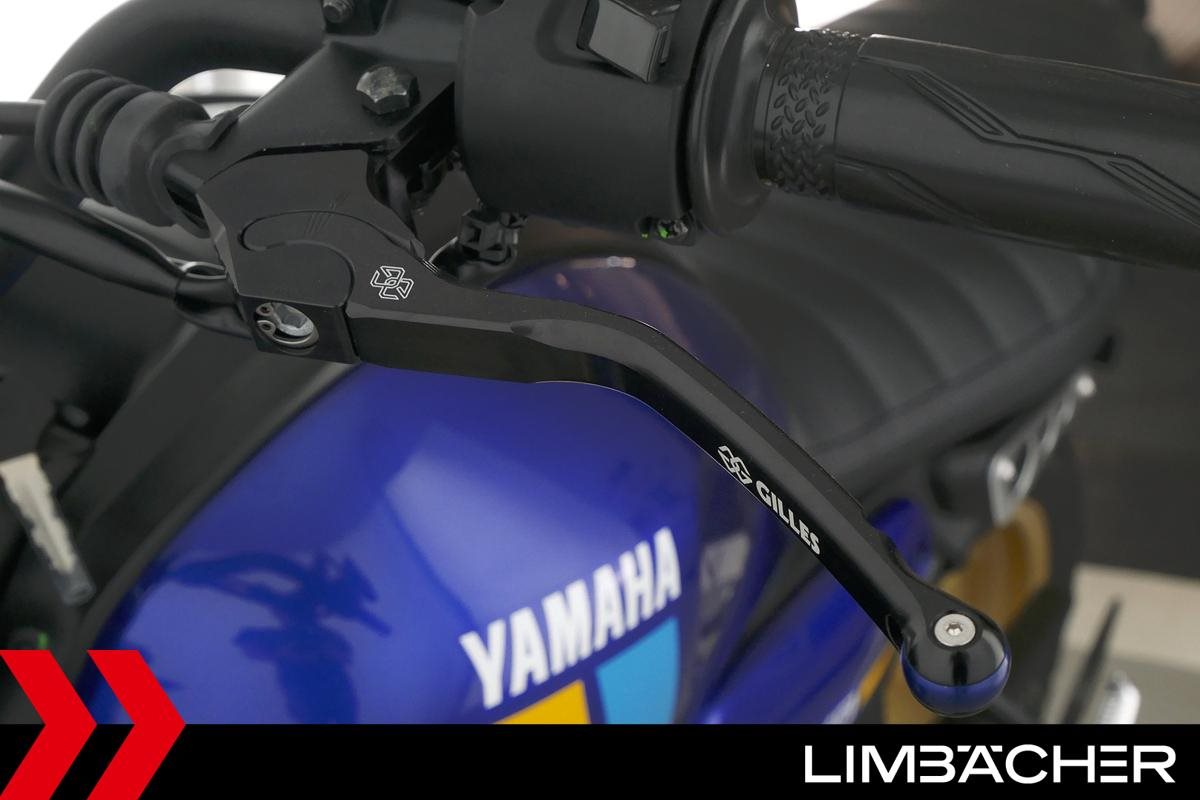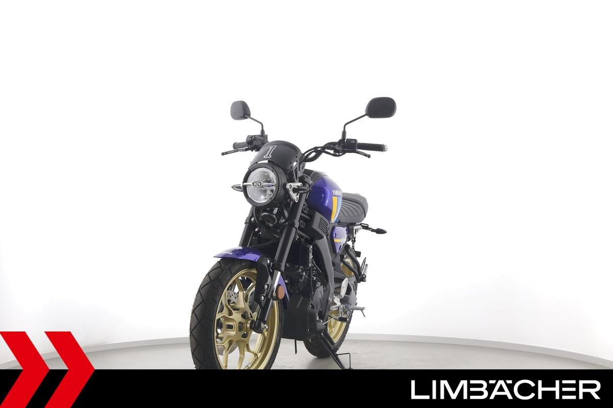 Eine Yamaha XSR 125 als Neufahrzeug u.a. mit gefrästen Brems- und Kupplungshebeln und kurzem Kennzeichenhalter.